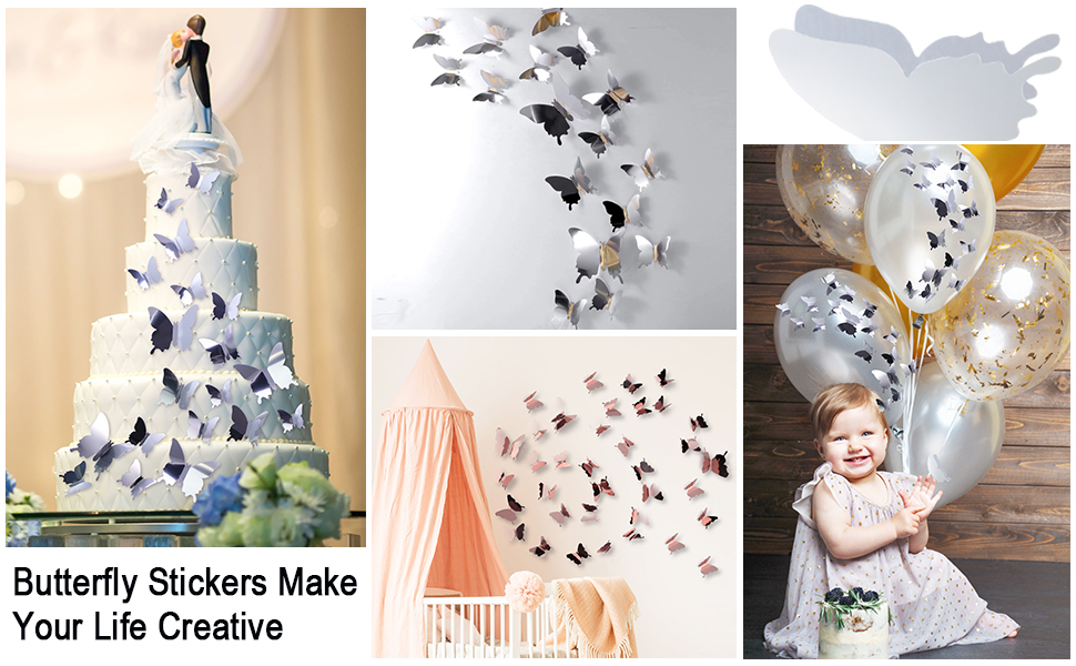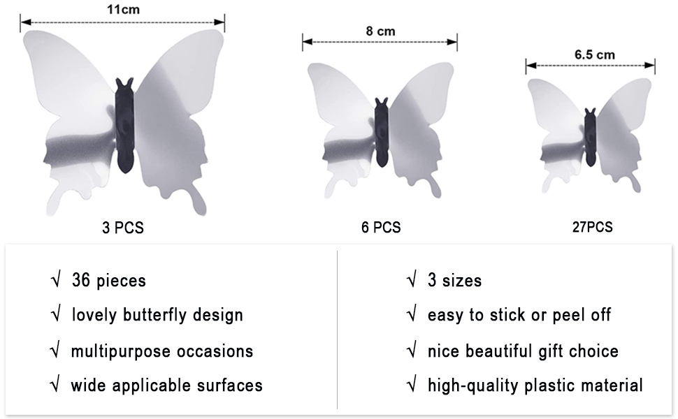 - Quantity: 1 set of sticker includes 3 pieces of large, 6 pieces of middle and 27 pieces of small, 36 pieces of butterfly in total, each set comes with double-sided tape